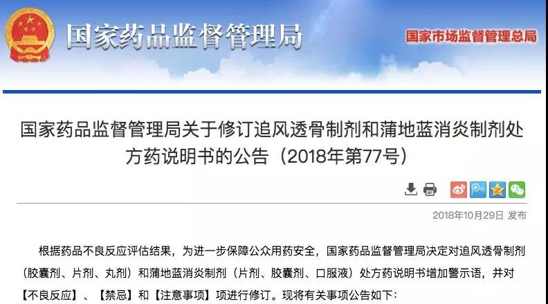 今日(10月29日)下午,国家药监局发布《关于修订追风透骨制剂和蒲地蓝消炎制剂处方药说明书的公告(2018年第77号)》。