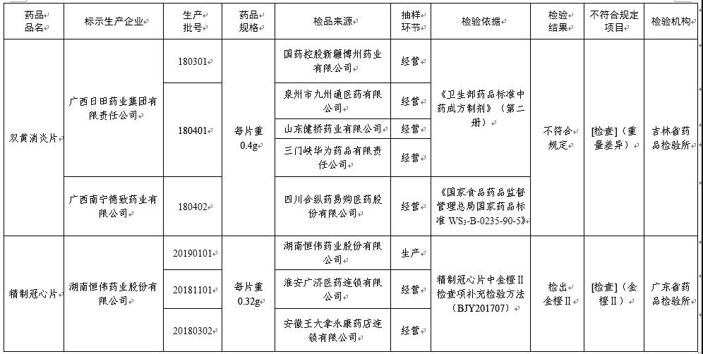 经吉林省药品检验所检验,标示为广西日田药业集团有限责任公司、广西南宁德致药业有限公司生产的3批次双黄消炎片不符合规定,不符合规定项目为重量差异。