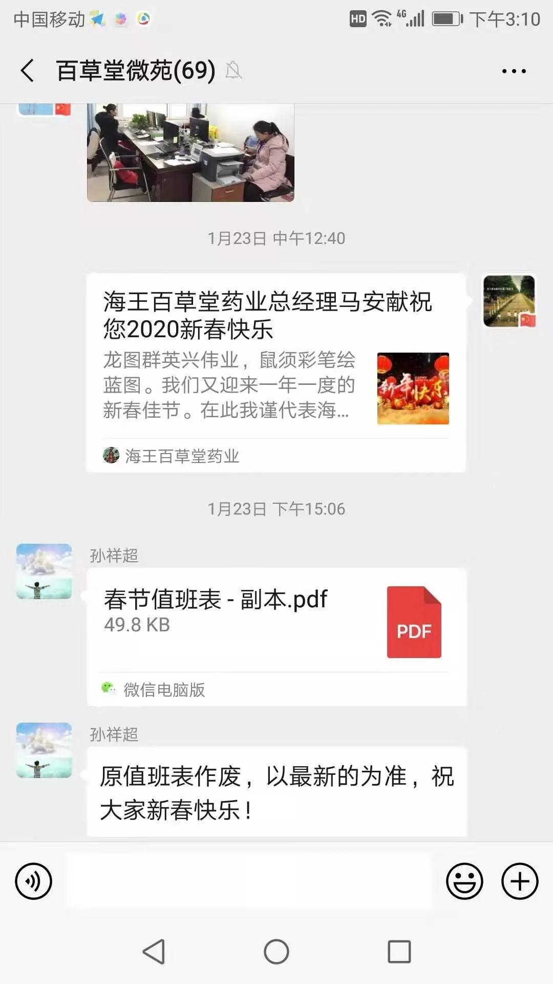 尽管是临时安排,又逢最重要的传统节日,但一句句“收到”、“收到”、“按时值班”、“绝不耽误工作”,彰显了海王百草堂员工的大局意识和职业操守。各岗位值班同志放弃和亲人团聚的机会,毅然返回岗位,投身这场“没有硝烟的战争”