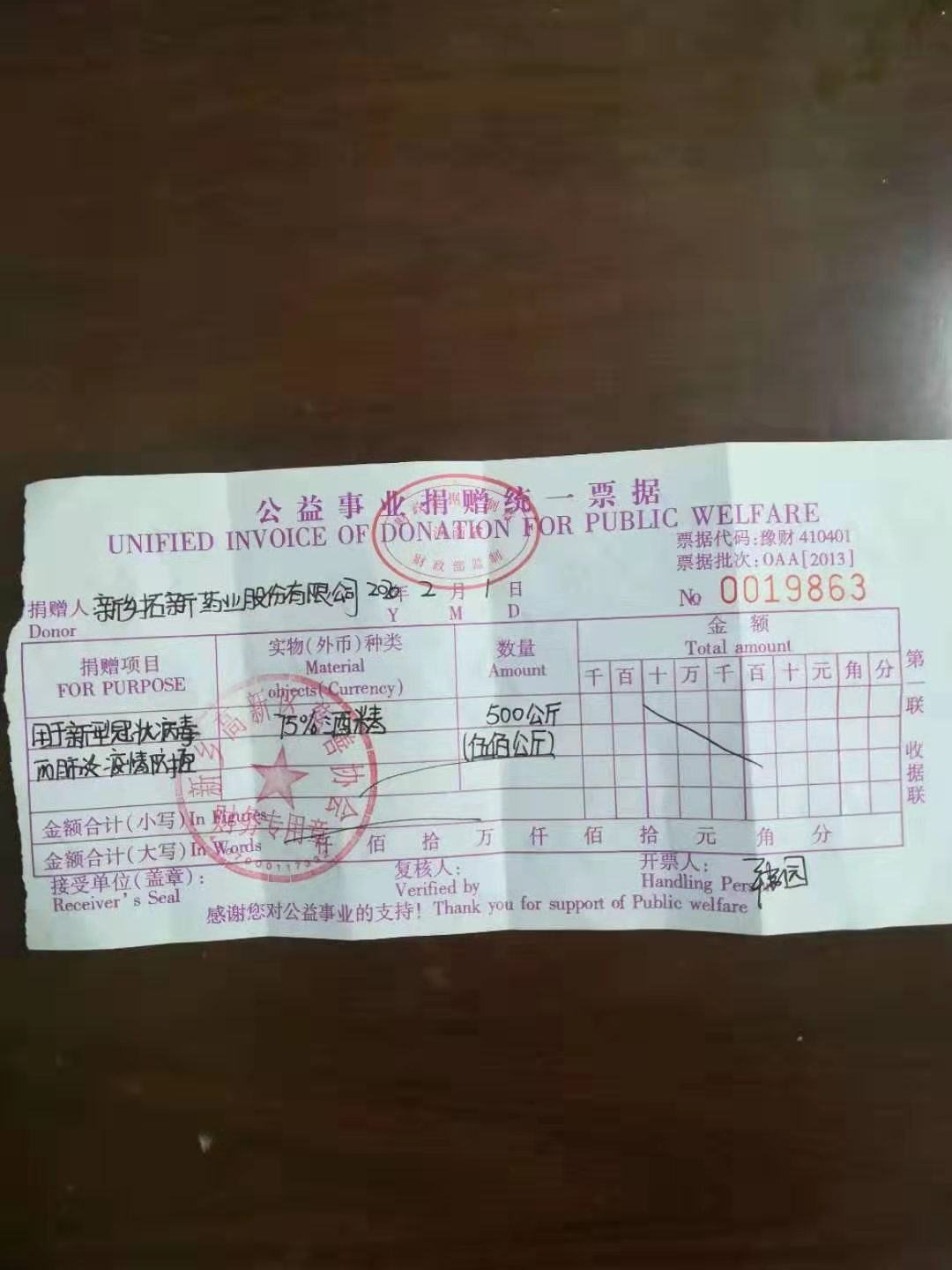 河南省制药工业协会获悉,新乡拓新药业股份有限公司向新乡高新区慈善协会捐赠75%酒精500公斤,用于疫情防控。