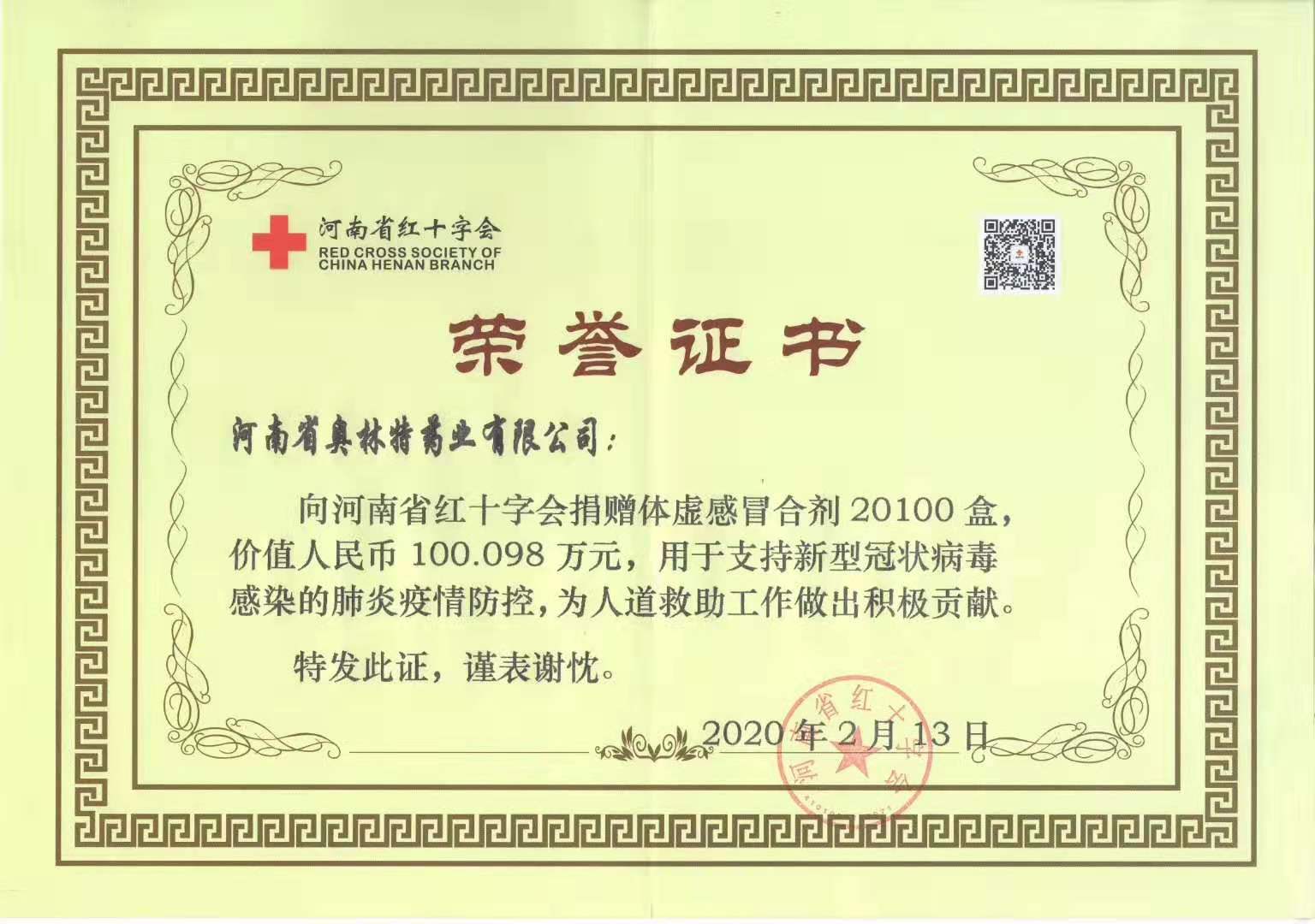 2月13日,河南省奥林特药业有限公司向河南省红十字会捐增体虚感冒合剂价值100多万元,用于支持抗击新冠肺炎疫情。