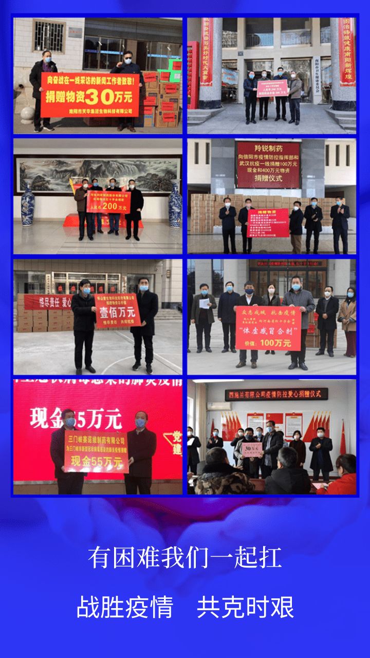 疫情就是命令,防控就是责任。新型冠状病毒疫情发生以来,全国各界在以习近平总书记为核心的党中央领导下,同舟共济、万众一心,按照党中央、国务院,当地党委政府的疫情防控工作部署,全力开展疫情防控。河南省药品生产企业心系防控一线,积极响应号召,纷纷捐赠疫情防控所需的食品、药品、防护等各类疫情防控物资及款项。