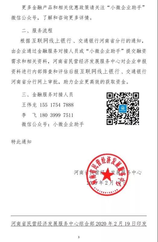 应对疫情,河南省民营经济发展服务中心近日联合互联网银行、交通银行河南分行组建“小微企业金融服务平台”,针对河南民营企业推出一系列成本低、时间快、方式多样的金融服务方案,努力解决民营企业融资难、融资贵、融资慢问题。