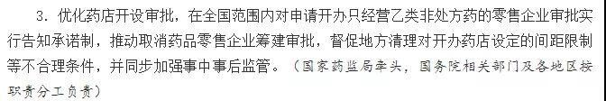 《方案》指出:优化药店开设审批,在全国范围内对申请开办只经营乙类非处方药的零售企业审批实行告知承诺制,推动取消药品零售企业筹建审批,督促地方清理对开办药店设定的间距限制等不合理条件,并同步加强事中事后监管。