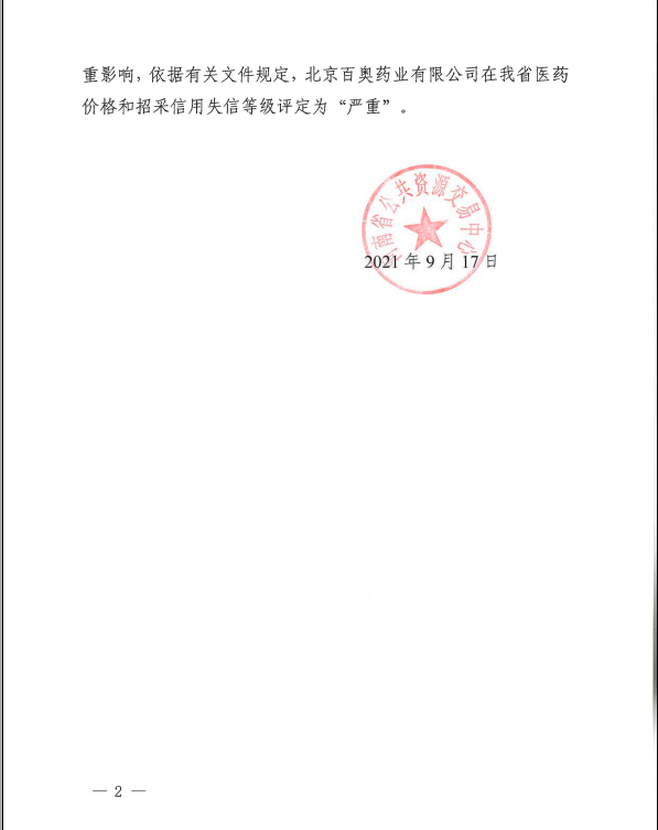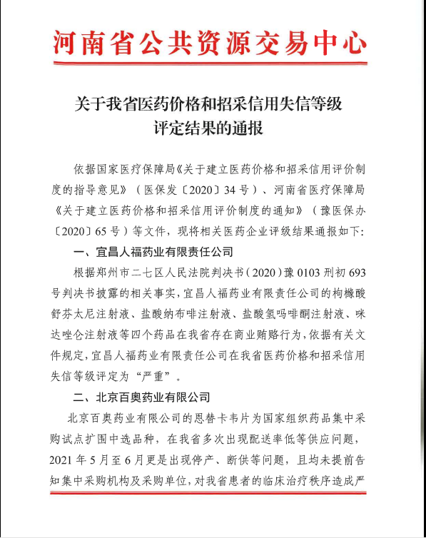 关于我省医药价格和招采信用失信等级评定结果的通报