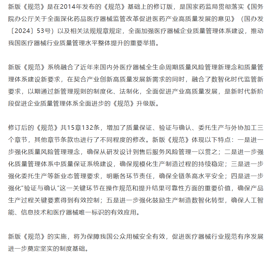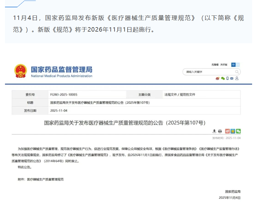 《医疗器械生产质量管理规范》修订发布 2026年11月1日起施行