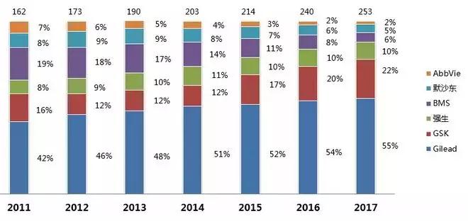 同时有一个我们不得不承认的事实,全球艾滋病药物市场主要玩家仍是6家制药巨头,但只有吉利德、GSK保持了扩张,蚕食其他几家企业的市场份额。