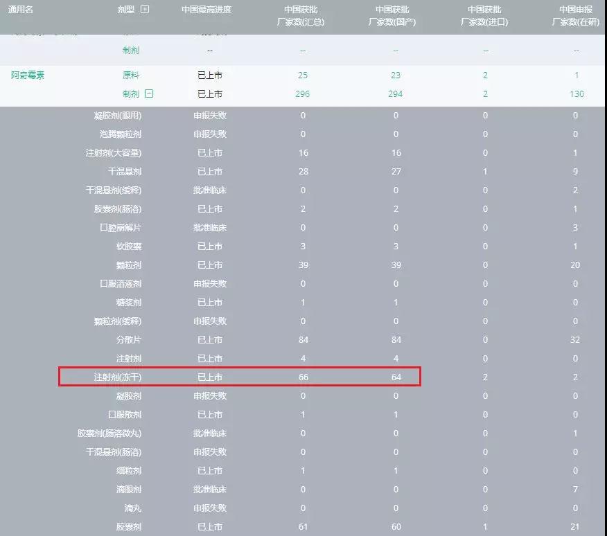 注射用阿奇霉素 500mg 是普利制药同步申报中国和美国注册的双报品种,已于 2015 年 10 月获得美国 FDA 的暂时性批准。根据医药魔方数据库,国内共有阿奇霉素制剂生产厂家296家,其中注射剂生产厂家66家。普利制药如今以通过一致性评价的身份国内上市,将对其他生产企业形成压力。