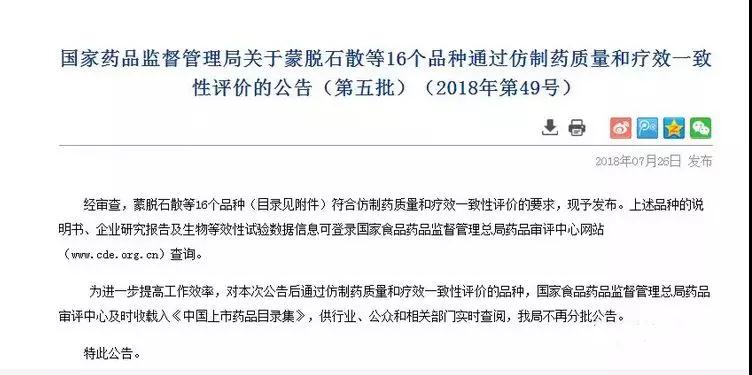 上周,国家药监局发布了《关于蒙脱石散等16个品种通过仿制药质量和疗效一致性评价的公告(第五批)》。