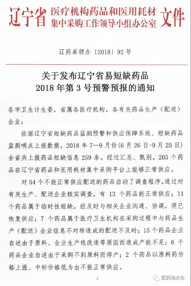 11月7日,辽宁省药品和医用耗材集中采购网发布《关于发布辽宁省易短缺药品2018年第3号预警预报的通知》。