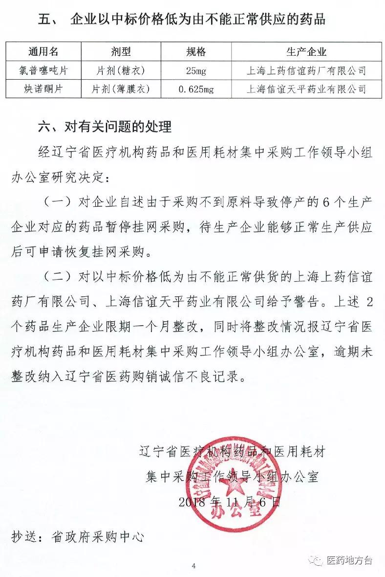 对以中标价格低为由不能正常供货的上海上药信谊药厂有限公司、上海信谊天平药业有限公司给予警告。上述2个药品生产企业限期一个月整改,同时将整改情况报辽宁省医疗机构药品和医用耗材集中采购工作领导小组办公室,逾期末整改纳入辽宁省医药购销诚信不良记录。