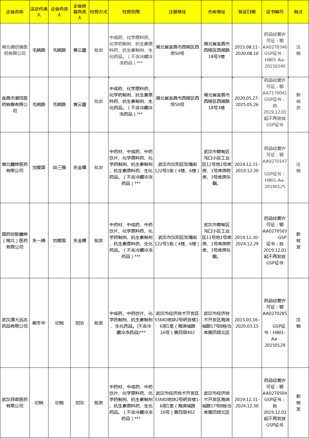 公告内容中指出:根据《中华人民共和国药品管理法》及其实施条例、《中华人民共和国行政许可法》和《药品经营许可证管理办法》等有关规定,经湖北省药监局审查,湖北德欣缘医药有限公司符合我省药品流通企业兼并重组的有关规定和要求,准予该公司申请注销《药品经营许可证》和《药品经营质量管理规范认证书》,新申报核发宜昌市潜民医药销售有限公司《药品经营许可证》和《药品经营质量管理规范认证证书》。现已经过湖北省药监局现场认证检查,符合规定要求,准予新核发。