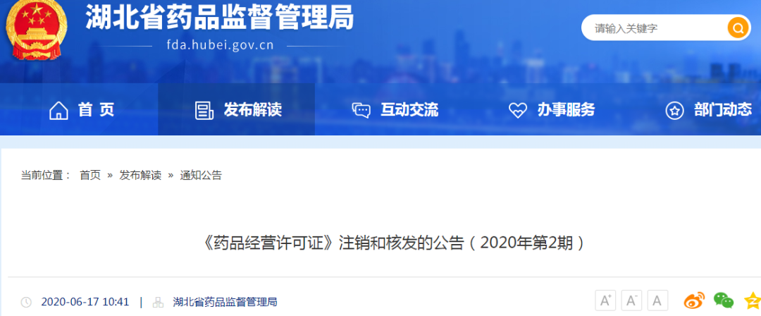 6月17日,湖北省药监局发布了一则《药品经营许可证》注销和核发的公告。