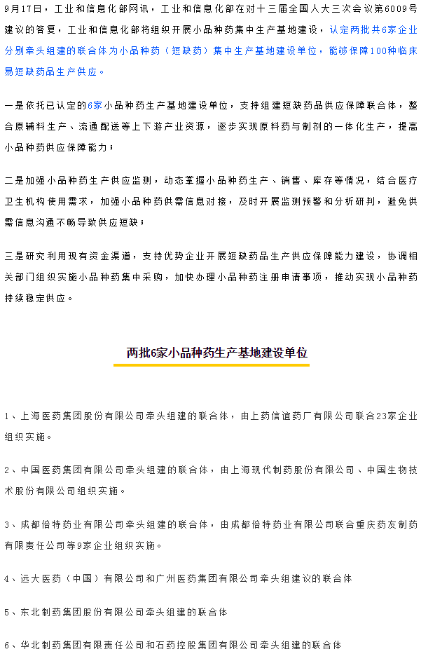 下一步,工业和信息化部将组织开展小品种药集中生产基地建设,保障临床易短缺药品生产供应。一是依托已认定的6家小品种药生产基地建设单位,支持组建短缺药品供应保障联合体,整合原辅料生产、流通配送等上下游产业资源,逐步实现原料药与制剂的一体化生产,提高小品种药供应保障能力;二是加强小品种药生产供应监测,动态掌握小品种药生产、销售、库存等情况,结合医疗卫生机构使用需求,加强小品种药供需信息对接,及时开展监测预警和分析研判,避免供需信息沟通不畅导致供应短缺;三是研究利用现有资金渠道,支持优势企业开展短缺药品生产供应保障能力建设,协调相关部门组织实施小品种药集中采购,加快办理小品种药注册申请事项,推动实现小品种药持续稳定供应。