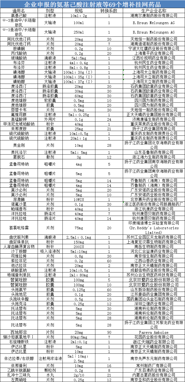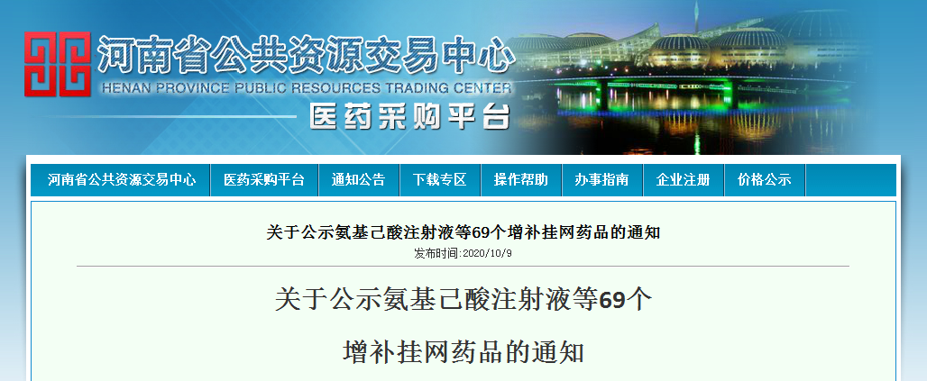 10月9日,河南省医药采购平台发布《关于公示氨基己酸注射液等69个增补挂网药品的通知》。
