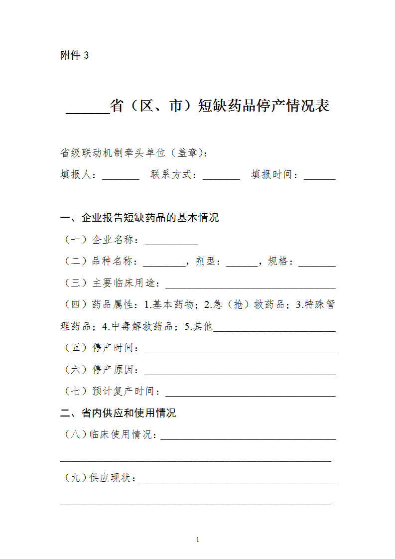 药品上市许可持有人按照相关规定对国家短缺药品清单的药品实施停产报告。所在地省级药品监管部门接到报告后,应当及时通报省级联动机制牵头单位。省级联动机制牵头单位接到相关短缺药品停产报告后,应当将停产品种、停产时间、停产原因、预计复产时间、省内供应和使用情况报告国家卫生健康委。国家卫生健康委适时将短缺药品停产报告情况向国家联动机制成员单位和地方进行通报。